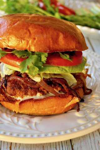 “A fiery, flavor-packed burger loaded with spicy patties, fresh veggies, and zesty sauces, served in a soft bun for a bold, satisfying bite.”